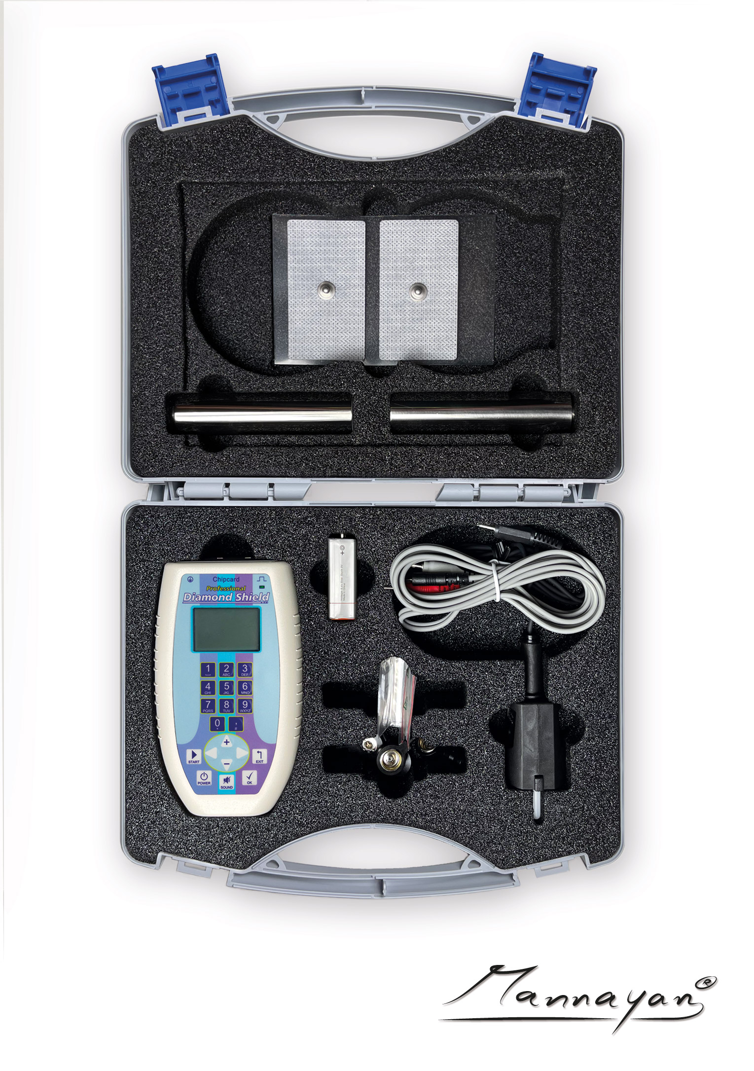 | Scope of delivery: | 2 adhesive electrodes 80 x 45 mm, 3x Master Chipkarte, 9V block battery and battery charger, Database chipcard TOP121, Diamond Shield IE EMS Professional, Earthing cable, Electrode Cable, Frequenzfibel II, Hand electrodes, stainless steel, Plastic case, Socket outlet tester |