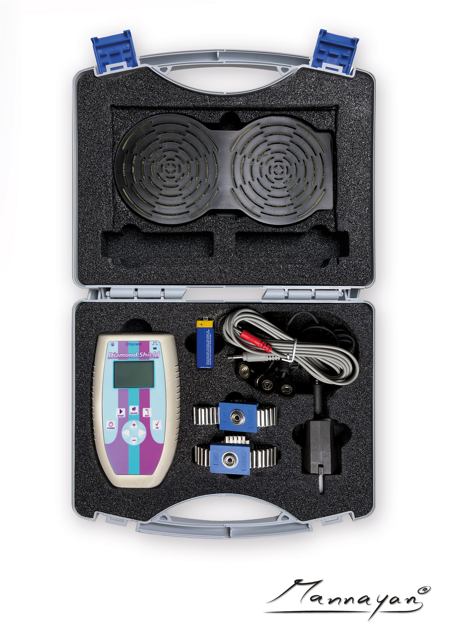 | Scope of delivery: | 1x Chipkarte BiBlo, 1x Chipkarte DTX, 2 adhesive electrodes 80 x 45 mm, 9V block battery, Diamond Shield Zapper IE EMS, Earthing cable, Electrode Cable, Metal wristband cuffs, Plastic case, Socket outlet tester |
