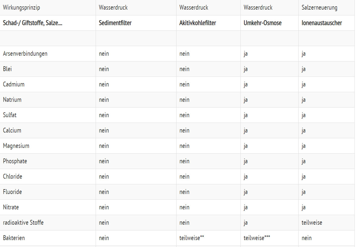 *** Tap water contaminated with pathogenic germs is extremely rare. In the case of contaminated well water, all manufacturers recommend a UV disinfection lamp or other suitable desinfection methods, as living bacteria can, in the worst case, settle down on or grow through the membrane, if a system has not been in use for a long time.